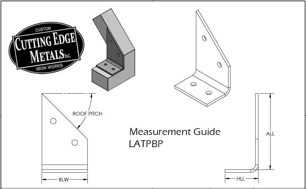 Secure roof rafters to your top plate or bottom plate (the horizontal beam atop posts that forms the base of the roof pitch) with our premium LATPBP L angle timber pitch rafter brackets – the custom L-shaped steel connector designed specifically for precise, strong pitched roof connections in decks, pergolas, porches, gazebos, pavilions, timber frame roofs, or sloped outdoor structures. Unlike generic slopeable hangers, fixed ridge connectors, or basic rafter ties that often need field bending, shimming, or result in gaps/misalignment at pitch, every LATPBP is handcrafted in our Wisconsin shop to your exact rafter dimensions, pitch angle, plate interface, and specs—ensuring the bracket sits flush on top of the plate, cradles the rafter securely, and delivers flawless load transfer with a clean, professional look.Why Choose Cutting Edge Metals LATPBP L Angle Pitch Rafter Brackets?